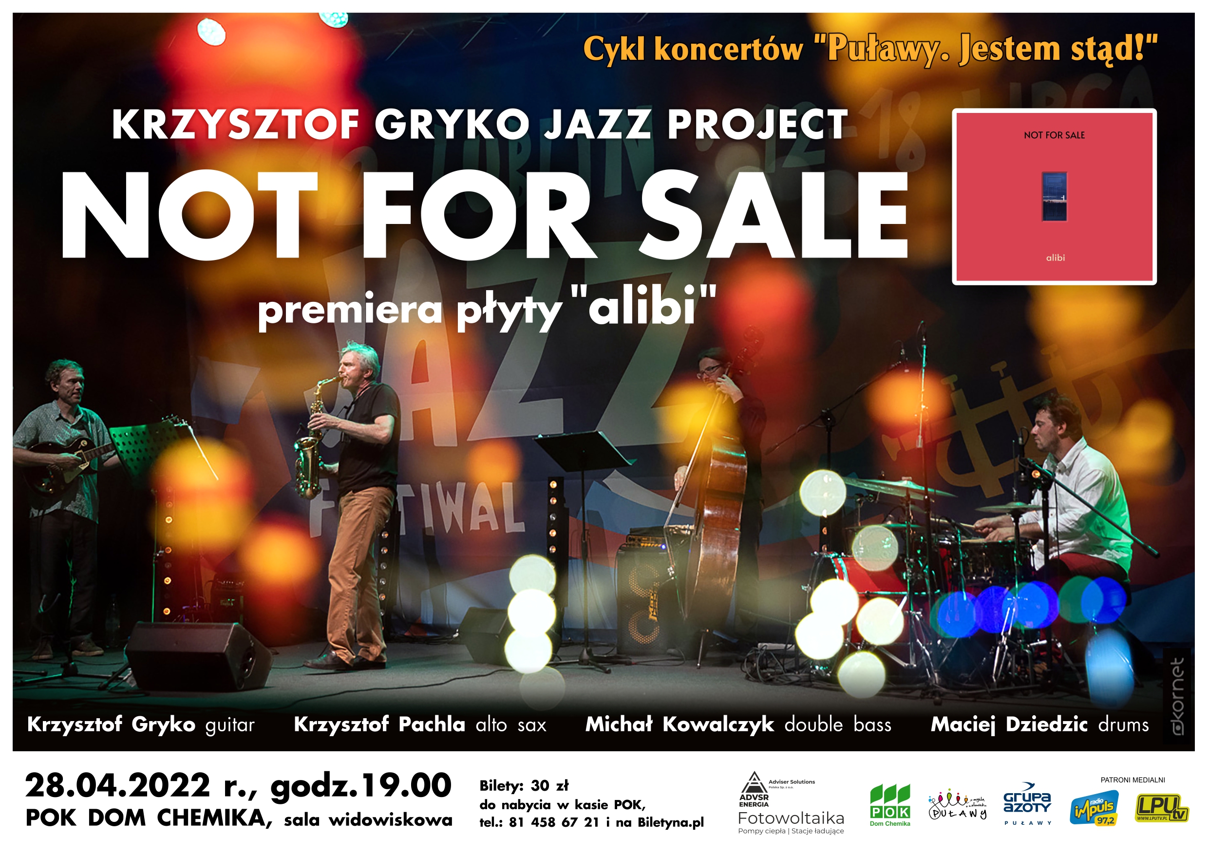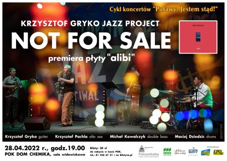 28 kwietnia na sali widowiskowej „Domu Chemika” usłyszymy kolejny z koncertów z cyklu „Puławy. Jestem stąd”. Tym razem na naszej scenie zagra zespół Krzysztofa Gryko Not For Sale. Jazzowy projekt inspirowany jest m. in. muzyką kina lat 60. i takimi ikonami polskiego jazzu jak Krzysztof Komeda. Koncert promuje wydaną przez zespół latem tego roku płytę „Alibi”.