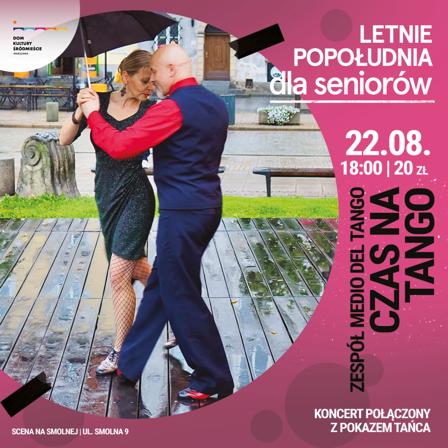 Zespół Medio del tango zaprasza serdecznie wszystkich na koncert pt. „Czas na tango”. Podczas występu zabrzmią najpiękniejsze melodie tangowe – zarówno w wersji wokalnej jak i instrumentalnej, a do wybranych utworów zatańczy para profesjonalnych tancerzy tanga. Koncert będzie wzbogacony opowieścią o tym gatunku tańca i jego historii w Polsce, w Argentynie i na świecie. Tango jest wyjątkowym zjawiskiem kulturowym, bo powstało w oparciu o uczucia i emocje, a te są przecież bliskie każdemu z nas, niezależnie od wieku, czy miejsca zamieszkania. To właśnie ten uniwersalny charakter tanga sprawia, że muzyka, która mu towarzyszy, trafia serca do każdego odbiorcy.