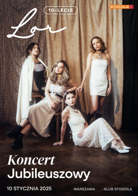 10 stycznia 2025 roku w Klubie Stodoła odbędzie się jubileuszowy koncert zespołu Lor, z okazji 10-lecia aktywności scenicznej! Julia Skiba, Paulina Sumera, Jagoda Kudlińska i Julia Błachuta zaprezentują warszawskiej publiczności materiał z ich wszystkich wydawnictw, więc będzie to nie lada gratka dla fanów, bo takiego koncertu jeszcze nie było! Ponadto, zespół przedstawi materiał z nadchodzącego albumu, którego premierę zaplanowano na jesień tego roku. Nie zabraknie również kilku muzycznych niespodzianek! Bilety dostępne w sprzedaży.