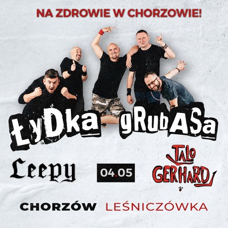 Cześć! Kłania się Łydka Grubasa - zapraszamy na wyjątkowy koncert do chorzowskiej Leśniczówki! W pięknych okolicznościach przyrody odpalamy mały plenerek, na scenie pod dużym namiotem, przy grillu i kijaszku mamy zamiar pograć dla Was utwory. Oczywiście, jak najbardziej na luzie, z piwkiem w ręku i pod drzewkiem. Wszak to będzie bardzo dłuuuuugi weekend majówkowy, i na pewno miło będzie go spędzić razem młócąc na gitarach i zażywając wywczasu!