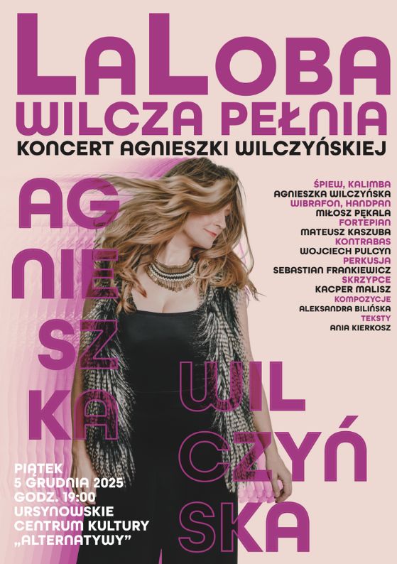 Dziesięć piosenek i dziesięć historii o kobiecie. Utkane z doświadczenia, pamięci ciała i wewnętrznego głosu, tworzą opowieść o kobiecie wolnej, dojrzałej i świadomej, która ufa swojej intuicji i pierwotnej mądrości. To opowieść o śpiewie stającym się językiem duszy i pieśni będącej powrotem do źródła, do wspomnienia tego, kim jesteśmy i skąd pochodzimy. Usłyszymy kompozycje Aleksandry Bilińskiej do tekstów Ani Kierkosz w znakomitych aranżacjach Miłosza Pękali, tworzących przestrzeń dla zmysłowego, silnego i pełnego emocji głosu Agnieszki Wilczyńskiej. To właśnie ona, jako LaLoba – Kobieta Wilk, przejmuje scenę, prowadząc słuchaczy przez świat symboli, rytmu i wewnętrznego ognia. W projekcie udział biorą Agnieszka Wilczyńska (śpiew, kalimba), Miłosz Pękala (aranżacje, wibrafon, handpan), Aleksandra Bilińska (kompozycje), Ania Kierkosz (teksty). Na scenie zagrają także: Mateusz Kaszuba (fortepian), Sebastian Frankiewicz (perkusja), Wojtek Pulcyn (kontrabas), Kacper Malisz (skrzypce).