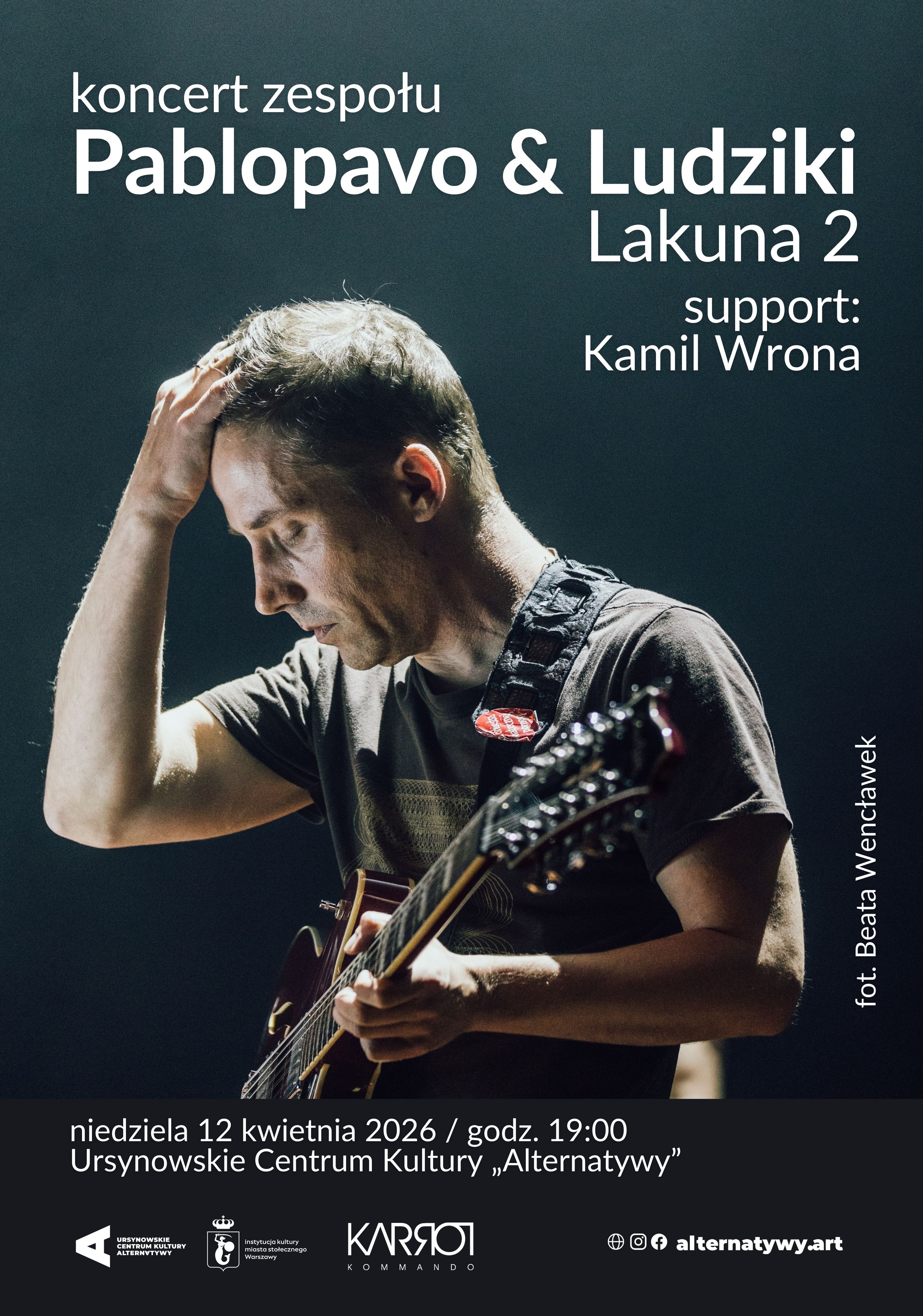Album „Lakuna 2” to naturalna, ale wyraźnie pogłębiona kontynuacja pierwszej części tego muzycznego projektu. Materiał idzie dalej i mocniej – bywa szybszy, bardziej mroczny, intensywniejszy emocjonalnie, ale nie brakuje w nim momentów światła i czułości. To płyta do tańczenia, do słuchania z kubkiem herbaty, w towarzystwie sąsiada z bloku, nawet jeśli jest tylko wyobrażony. Pierwsza „Lakuna” balansowała między psychodelicznym country, funkiem i muzyką taneczną, niosąc jednocześnie melancholię i refleksję nad przemijaniem. W drugiej odsłonie spektrum stylistyczne poszerza się: pojawiają się odniesienia do wczesnych form hip-hopu – sprzed ery komercji i sławy – oraz elementy quasifilmowej narracji dźwiękowej. Nie zabraknie również starszych utworów, sprawdzonych szlagierów i kilku „odkurzonych” piosenek z poprzednich płyt zespołu. Koncertowi Pablopavo & Ludzików towarzyszyć będzie występ Kamila Wrony – pianisty i autora piosenek, który po latach związanych z jazzem skoncentrował się na autorskiej twórczości, łącząc inspiracje cold wave’em, polską alternatywą i współczesną produkcją muzyczną. Koncert w „Alternatywach” będzie jedną z pierwszych okazji, żeby posłuchać Kamila Wrony po wydaniu debiutanckiej EP-ki i po wejściu w muzyczne szeregi agencji Karrot Kommando.