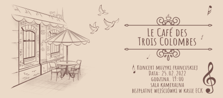 Piosenka francuska — pojęcie będące rekomendacją samo w sobie. Długa, piękna tradycja, do której na koncercie „Le Café des Trois Colombes” nawiążą Jacek Marchelski i przyjaciele. Spotkajmy się w „Kawiarni trzy gołębie” 25 lutego 2022 roku o godzinie 19:00. Choć realnie będziemy w sali kameralnej Ełckiego Centrum Kultury, to z pewnością poczujemy się, jakbyśmy znaleźli się nad brzegiem Sekwany, pod kolorową markizą w nastrojowej kafejce. Zasłuchani w poezję piosenki francuskiej odczujemy moc zawartej w niej miłości, od wieków symbolizowanej przez gołębie. Wystąpią: Jacek Merchelski i przyjaciele: Sylwia Błażewicz, Sylwia Kropiwnicka, Anna Skulimowska, Aleksandra Szejda, Urszula Wardzińska, Jolanta Wilczyńska, Marek Chojnowski, Marcin Pyciak, Daniel Szejda, Kamil Szejda, Artur Zubowicz