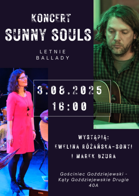 Zapraszamy na spotkanie muzyczne ze znanymi i lubianymi piosenkami polskich i zagranicznych wykonawców – popowych, rockowych, folkowych i z nurtu poezji śpiewanej, oraz irlandzkich utworów folkowych, w wykonaniu zespołu Sunny Souls. Koncert odbędzie się pod niebem Gościńca Goździejewskiego – wyjątkowego miejsca na kulturalnej i kulinarnej mapie wschodnich obrzeży Warszawy. Miejsca, w którym dusza i ciało mogą na chwilę zapomnieć o Bożym świecie.
