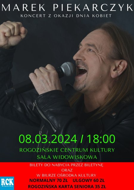 Zapraszamy na koncert Marka Piekarczyka, który odbędzie się 8 marca w sali widowiskowej ośrodka kultury w Rogoźnie.