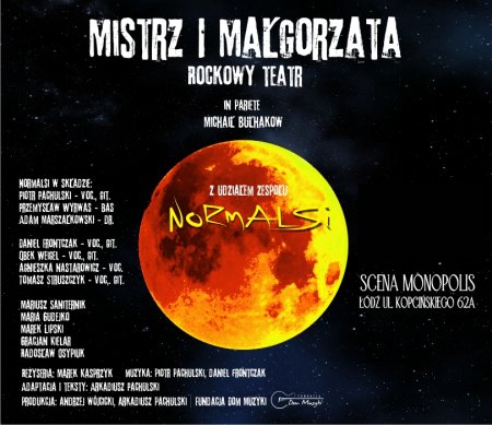 „Mistrz i Małgorzata Rockowy teatr” in pariete M. Bułhakow to kolejna, po kultowym spektaklu muzycznym „Łajza”, realizacja teatralna braci Pachulskich. Twórcy „Łajzy” zaprezentują „Mistrza i Małgorzatę” na deskach Sceny Monopolis w sposób, w jaki nikt dotychczas tego nie uczynił. Unikalna adaptacja w formie łączącej teatr dramatyczny i blues – rock – operę, premierowa muzyka grana na żywo, opowieść o Miłości i Sztuce w zderzeniu z komunizmem, o wolności, wierności i zdradzie, wreszcie o dealu medycyny i władzy totalitarnej. Ale i o mistycznej głębi ludzkiego życia. Normalsi zaprosili do scenicznej pracy nad arcydziełem Bułhakowa znakomitych łódzkich artystów – aktorów i muzyków. Już dziś gorąco zapraszamy na premierę „Mistrza i Małgorzaty” w reżyserii Marka Kasprzyka do teatru Scena Monopolis w Łodzi!