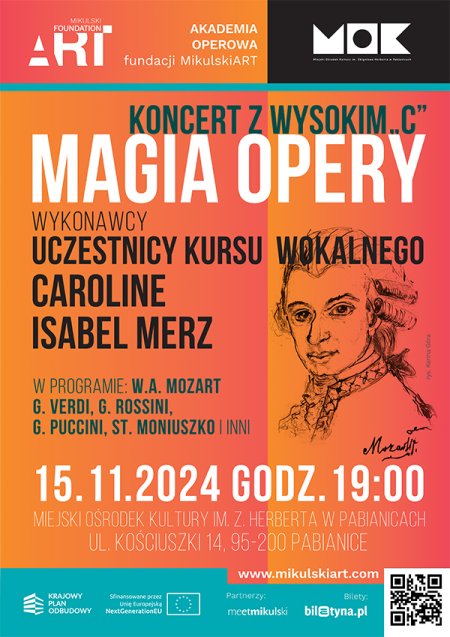 "Magia Opery - koncert z wysokim C" to wyjątkowe wydarzenie, podczas którego wystąpią utalentowani soliści i solistki międzynarodowych scen operowych, uczestnicy Akademii Operowej Fundacji MikulskiART. To elitarny kurs wokalny prowadzony przez światowej sławy solistkę Caroline Isabel Merz, znaną z występów m.in. na deskach Opery Wiedeńskiej.