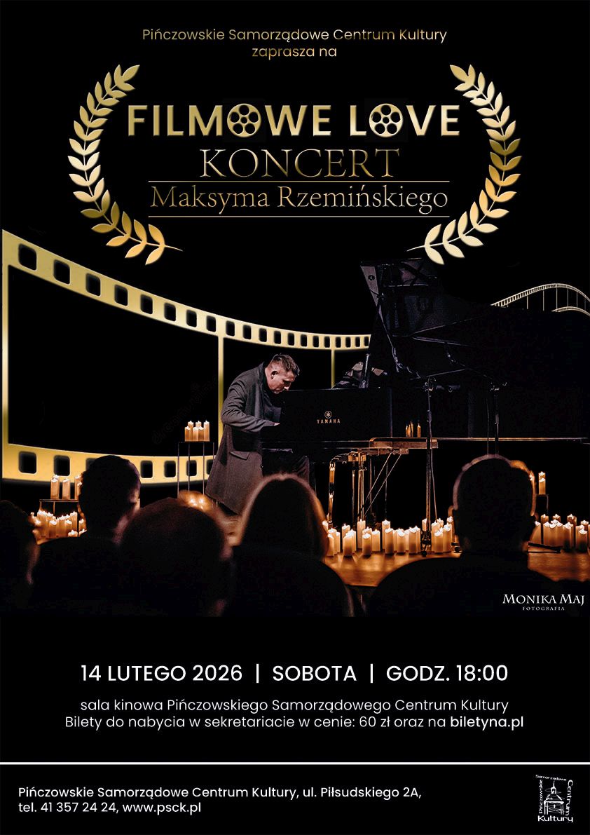 Gdy obraz spotyka dźwięk, rodzi się prawdziwa emocja. Zapraszamy na wyjątkowy koncert, który przeniesie Was do świata niezapomnianych filmowych dźwięków. Po raz kolejny w Pińczowie, w kameralnej przestrzeni, spotkamy się z wybitnym pianistą Maksymem Rzemiński, którego koncerty na długo zostają w naszej pamięci i sercach.
