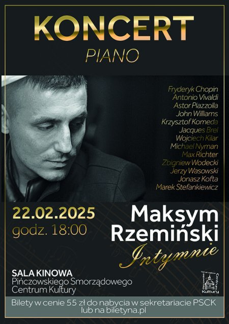 Wybitni twórcy i kompozytorzy, którzy w światowej i polskiej muzyce zapisali się złotymi nutami. Ponadczasowe kompozycje, które przekraczają granice epok, pokoleń i zawsze trafiają prosto do naszych serc. 22 lutego w Pińczowskim Samorządowym Centrum Kultury, w wyjątkowym i niepowtarzalnym wydaniu, zaprezentuje je pianista Maksym Rzemiński, którego koncerty zawsze dostarczają nam cały wachlarz emocji, wzruszeń i muzycznych uniesień. W programie koncertu znajdą się premierowe wykonania utworów z najnowszej płyty Maksyma Rzemińskiego, która niebawem pojawi się w sprzedaży.