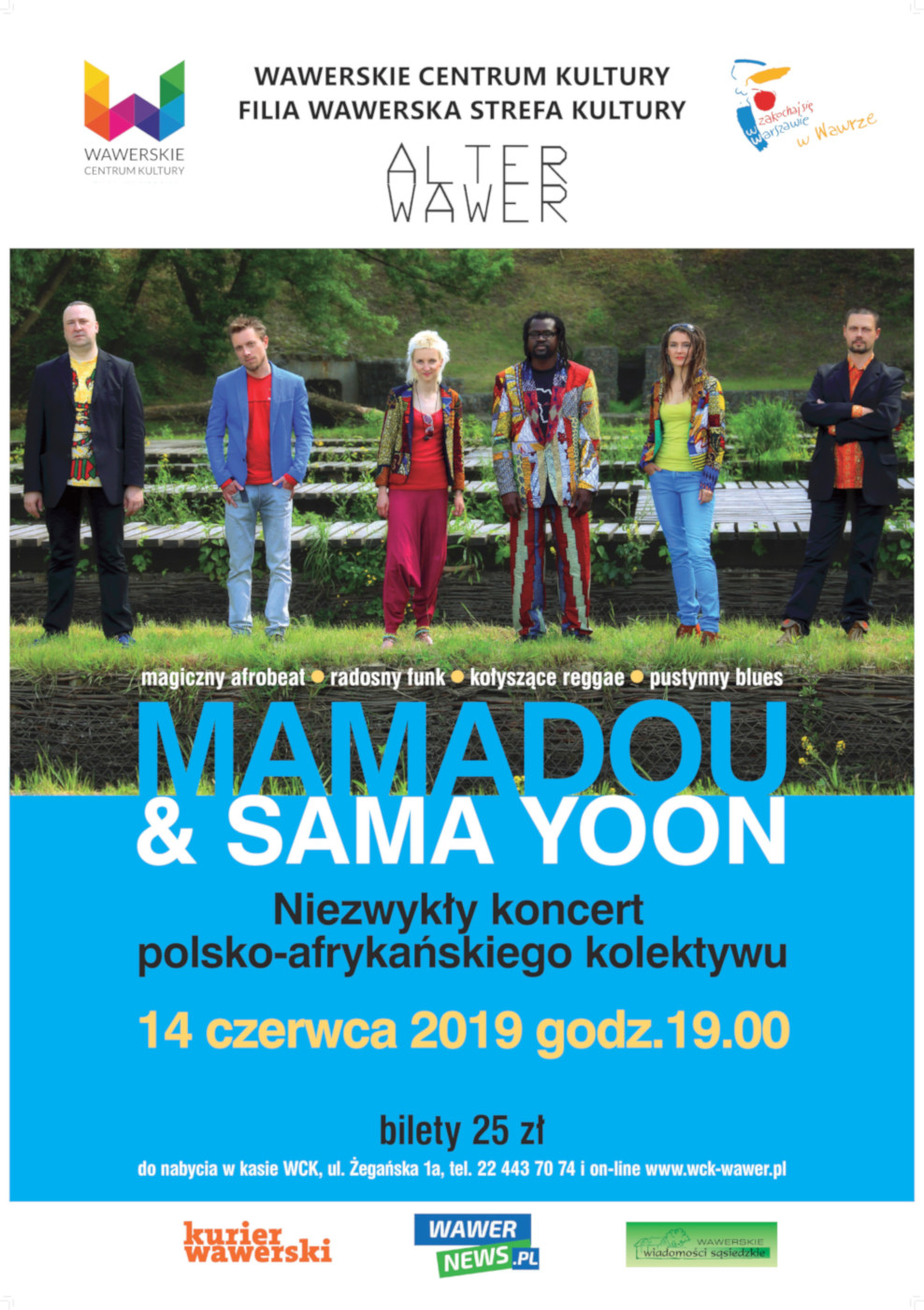 W ramach muzycznego projektu Alter Wawer zapraszamy na koncert polsko-afrykańskiego kolektywu Mamadou & Sama Yoon. Jego założycielem i liderem jest dziennikarz, muzyk i intrygujący wokalista - Senegalczyk Mamadou Diouf. W rodzimym języku Mamadou "sama yoon" oznacza: "moja droga, mój wybór", co bezbłędnie określa muzyczne credo zespołu. Każdy ich występ to pełen ekspresji tygiel afrykańskich tradycji, kultur i muzycznych gatunków. Przepełniony magicznym transem afrobeat spotyka się z wciągającym do tańca radosnym funkiem, a leniwe, choć z dużym pulsem, kołyszące reggae przeplata się z pełnym refleksji pustynnym bluesem. Afrykańską muzykę czują i grają znakomicie, stylowo, z żywiołową radością, dopełnioną śpiewanymi przez lidera w języku wolof piosenkami - opowieściami o tradycjach, szacunku i tęsknocie.