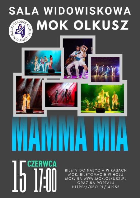 Zapraszamy już 15 czerwca do Sali Widowiskowej MOK w Olkuszu na niesamowite, wielokrotnie nagrodzone Show artystów, słynącego z wielkich hitów scenicznych Teatru Variete Muza z Koszalina. Zorganizowane z ogromnym rozmachem widowisko pt. "Mamma Mia" przeniesie nas do lat 70' i wielkiego triumfu szwedzkiego kwartetu ABBA na Eurowizji. Przez niemal dwie godziny poznamy całą historię tego fenomenu muzyki rozrywkowej i usłyszymy zagrane i zaśpiewane na żywo, między innymi takie przeboje jak: Waterloo, SOS, Mamma Mia, Super Trouper, Dancing Queen, I Have A Dream, Hasta Mañana, Money Money Money, Fernando, Honey, Honey, Take a chance on me, Gimme! Gimme! Gimme!, Chiquitita, Voulez-Vous, I Do, I Do, I Do, I Do, I Do czy Knowing Me Knowing You. Artyści wcielający się w rolę szwedzkich gwiazd, nie tylko swoją aparycją do złudzenia przypominają Anni-Frid Lyngstad, Benny'ego Anderssona, Björna Ulvaeusa i Agnethę Fältskog, ale i brzmią jak oryginalni wokaliści Abby. Właśnie z tego względu, nawet najwięksi sceptycy są oczarowani końcowym efektem ich występu!