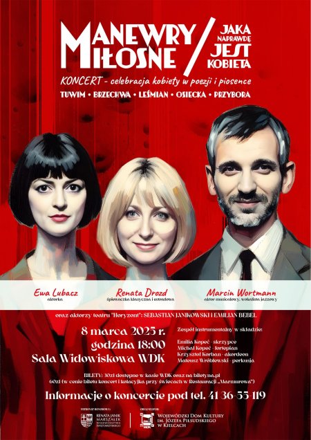 🎉 Przygotujcie się na wyjątkowy wieczór pełen poezji, piosenek i magii! 🎶 Dołącz do nas na koncert "Manewry miłosne - Jaka naprawdę jest kobieta", który celebruje piękno i siłę kobiecości w niezapomniany sposób!