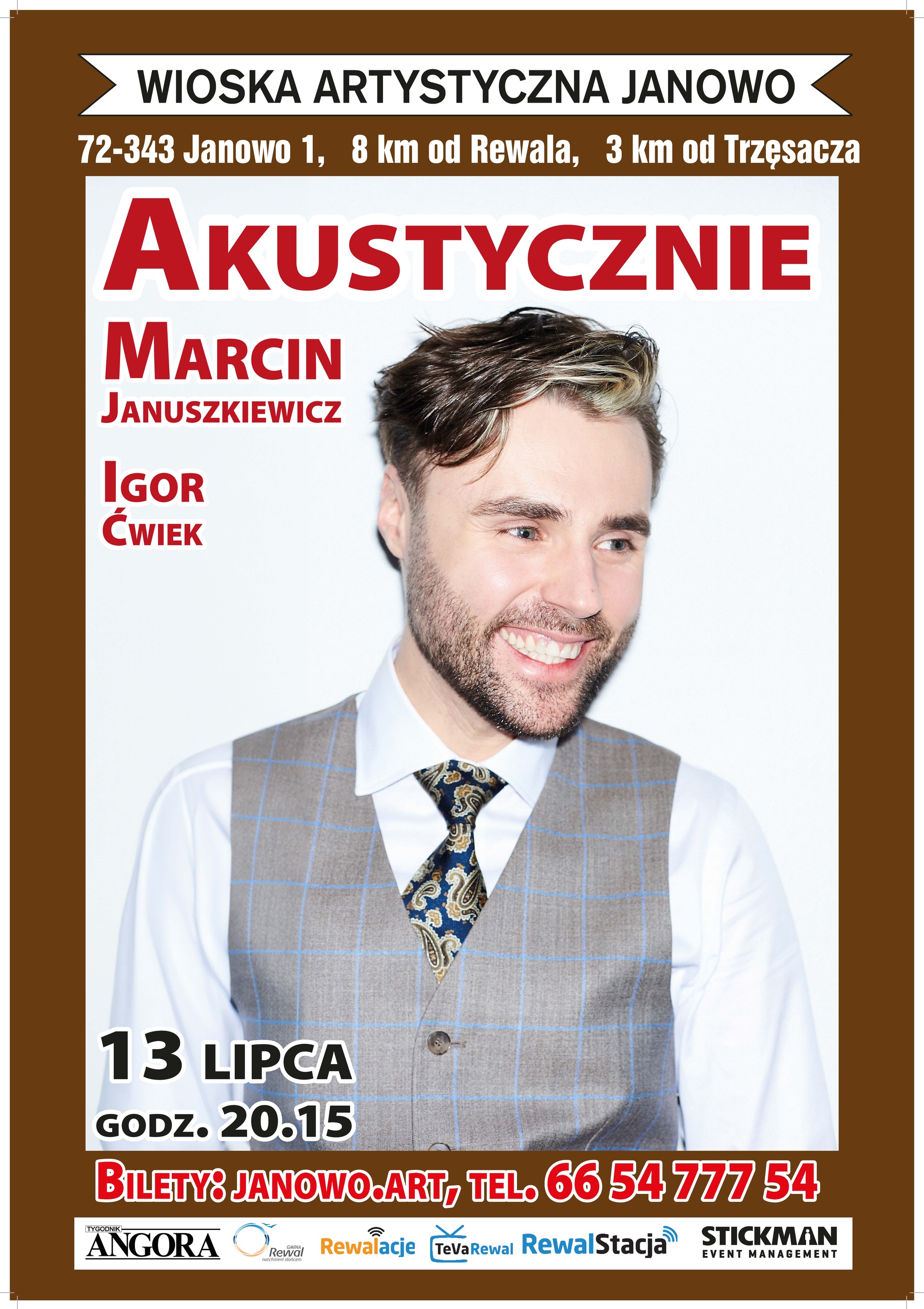 Akustyczny koncert Marcina Januszkiewicza – aktora i wokalisty, który zasłynął niebanalnymi interpretacjami piosenek Agnieszki Osieckiej. W 2017 roku ukazała się jego pierwsza solowa płyta zatytułowana „Osiecka po męsku”. Podczas występu w Janowie artysta zabierze publiczność w świat akustycznych dźwięków swoich ulubionych piosenek z kręgu muzyki pop, poezji śpiewanej oraz rockowych brzmień znanych z zespołu Amnezja (którego jest wokalistą). Towarzyszyć mu będzie gitarzysta Igor Ćwiek.