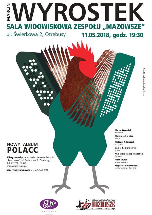 Zapraszamy na koncert Marcina Wyrostka z Zespołem Corazon i wokalistą Marcinem Jajkiewiczem z repertuarem z najnowszej płyty Polacc. Nowy album Marcina Wyrostka i jego zespołu znacząco różni się od jego dotychczasowej twórczości. Przez lata koncertowania z repertuarem o charakterze, argentyńskim, bałkańskim i latynoamerykańskim w muzykach pojawiła się potrzeba sięgnięcia do muzycznej kultury w której wzrastali. Zwrócenie się ku kulturze Polskiej było także związane z licznymi koncertami tematycznymi zespołu poza granicami Kraju, na których Marcin Wyrostek występował w roli promotora polskiej kultury. Powstałe przy tej okazji kompozycje i aranże stały się zalążkiem do powstania nowej płyty Marcin Wyrostek "Polacc", gdzie rozmaite motywy "Pol"- skości połączył wspólny "Acc" - ordeonowy mianownik. Na płycie znalazły się zarówno utwory inspirowane polską muzyką tradycyjną, filmową, żydowską czy polskimi tańcami ludowymi, jak i kompozycje wielkich mistrzów, m.in.: Henryka Mikołaja Góreckiego, Wojciecha Kilara, Witolda Lutosławskiego, Karola Szymanowskiego. Nie zabrakło także tematów zaczerpniętych z muzyki rozrywkowej lat 60. i 70., a przede wszystkim autorskich kompozycji artysty. Wszystkie utwory zilustrowane i zaaranżowane z muzyczną wrażliwością charakterystyczną dla Marcina Wyrostka.