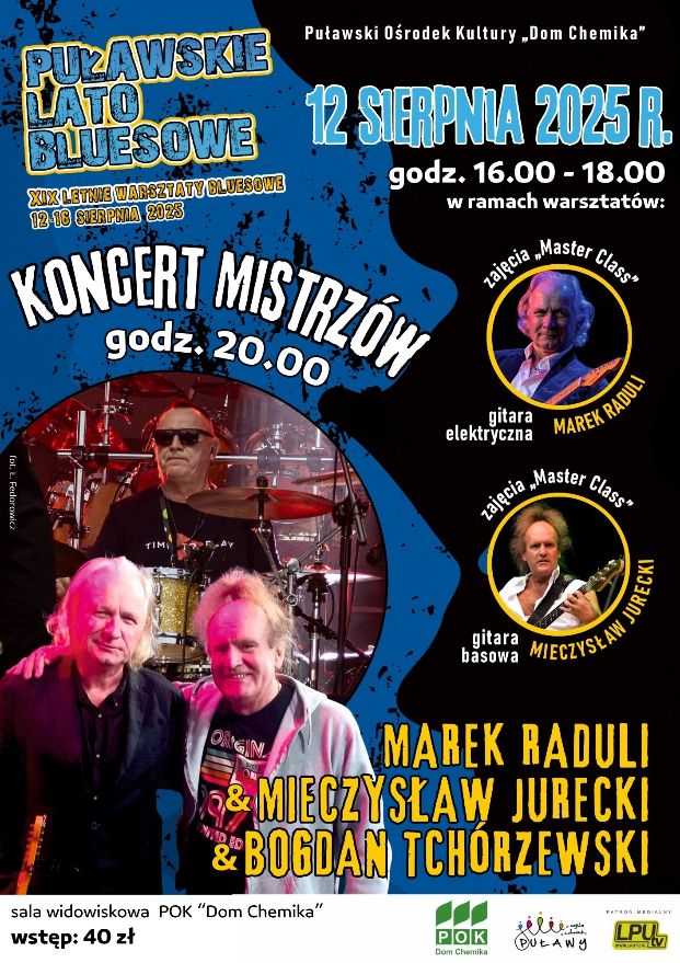 Już od 12 do 16 sierpnia Puławy ponownie staną się stolicą bluesa – wszystko za sprawą XIX Letnich Warsztatów Bluesowych w POK „Dom Chemika”! Na uczestników czeka pięć dni pełnych muzycznych emocji, niezapomnianych koncertów, jam sessions oraz intensywnych zajęć wokalnych i instrumentalnych prowadzonych przez wybitnych muzyków. Kulminacyjnym punktem będzie tradycyjny Koncert Finałowy, na którym uczestnicy zaprezentują swoje umiejętności przed puławską publicznością.