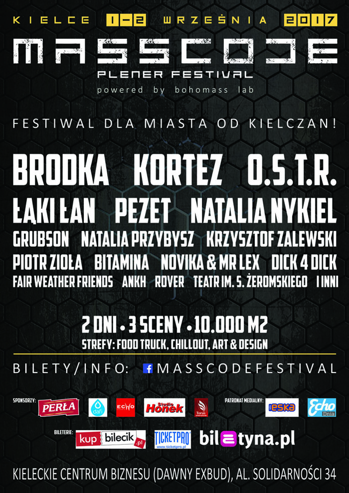 MASSCODE FESTIVAL będzie największą imprezą muzyczno-kulturalną jaka odbyła się dotychczas w Kielcach. Zlokalizowana zostanie na terenie Kieleckiego Centrum Biznesu (dawny Exbud) i zajmie powierzchnię 10.000m2. W dniach 1-2 września 2017 roku, na scenie głównej oraz dwóch scenach towarzyszących wystąpi cała masa doskonałych artystów.