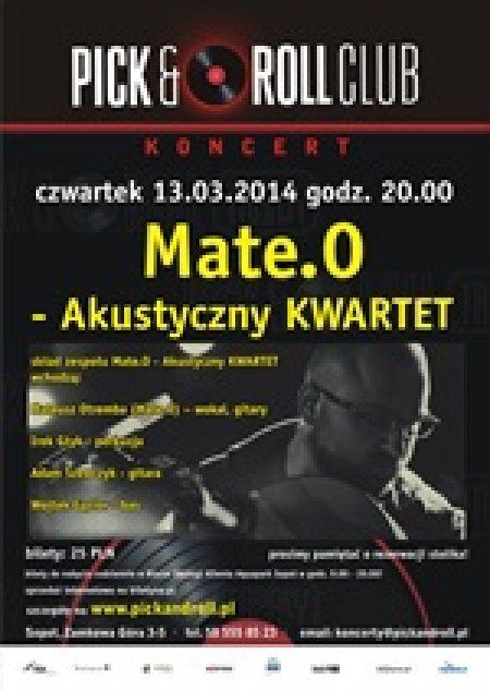 Mate.o Akustyczny Kwartet to fuzja wspaniałych osobowości muzycznych: Adam Szewczyk (gitary), Wojtek Gąsior(bas) oraz Irek Głyk (perkusja). Koncerty Mate.O Akustyczny kwartet to przestrzeń wypełniona brzmieniem akustycznych instrumentów oraz charakterystycznym i ekspresyjnym śpiewem Mate.O. Podczas koncertów usłyszymy głównie utwory z ostatniej płyty Mate.O, będzie też kilka niespodzianek.