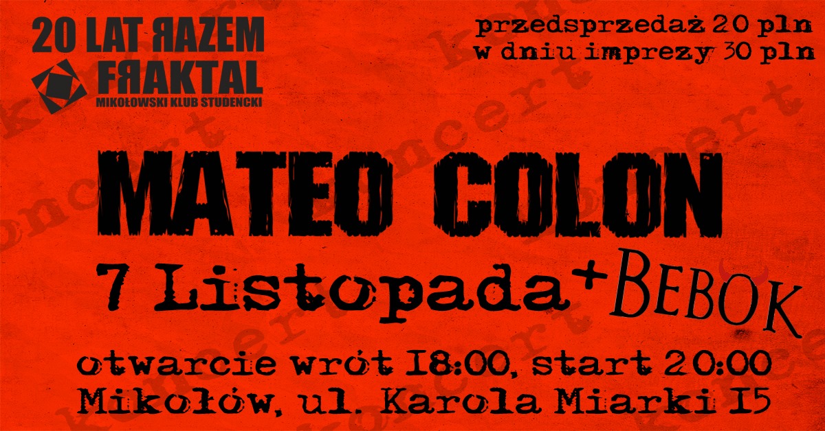 20 lat temu gdy swoje drzwi otwierał dla Was Fraczek grali Ci młodzi dżentelmeni. Teraz Mateo Colon również zagości na scenie. Tym razem zagrają z zespołem Bebok.