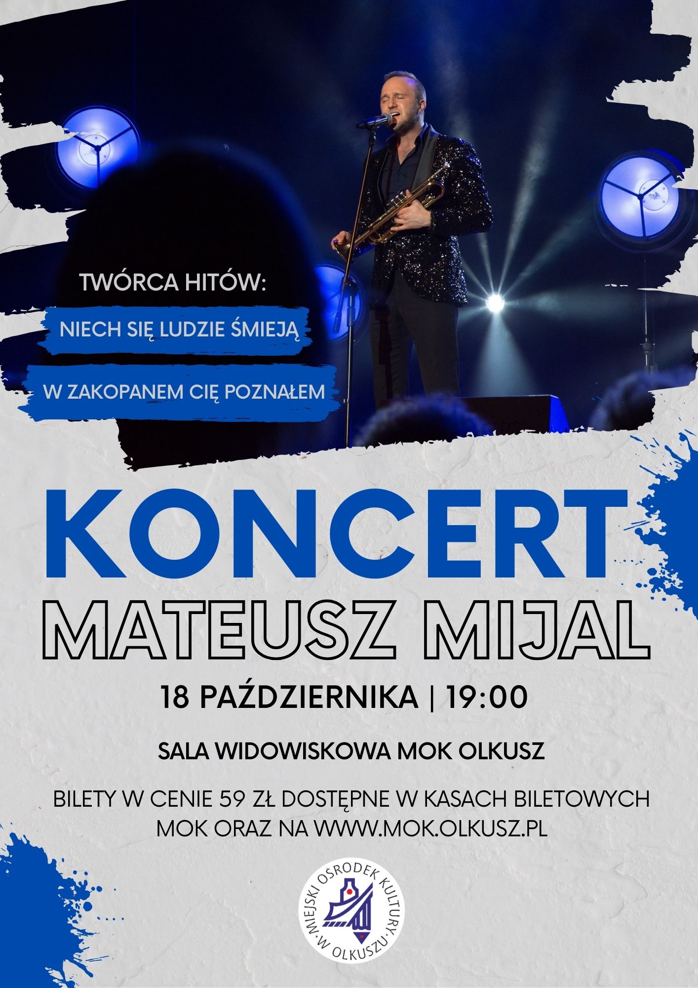 Już 18 października 2024 roku o godzinie 19:00 zapraszamy do sali widowiskowej Miejskiego Ośrodka Kultury w Olkuszu na wyjątkowy koncert Mateusza Mijala! Wokalista, znany z takich hitów jak „Niech się ludzie śmieją” czy „Winny”, który nagrał wraz z Liberem, zagra swoje największe przeboje, gwarantując niezapomniany wieczór pełen emocji i wrażeń.