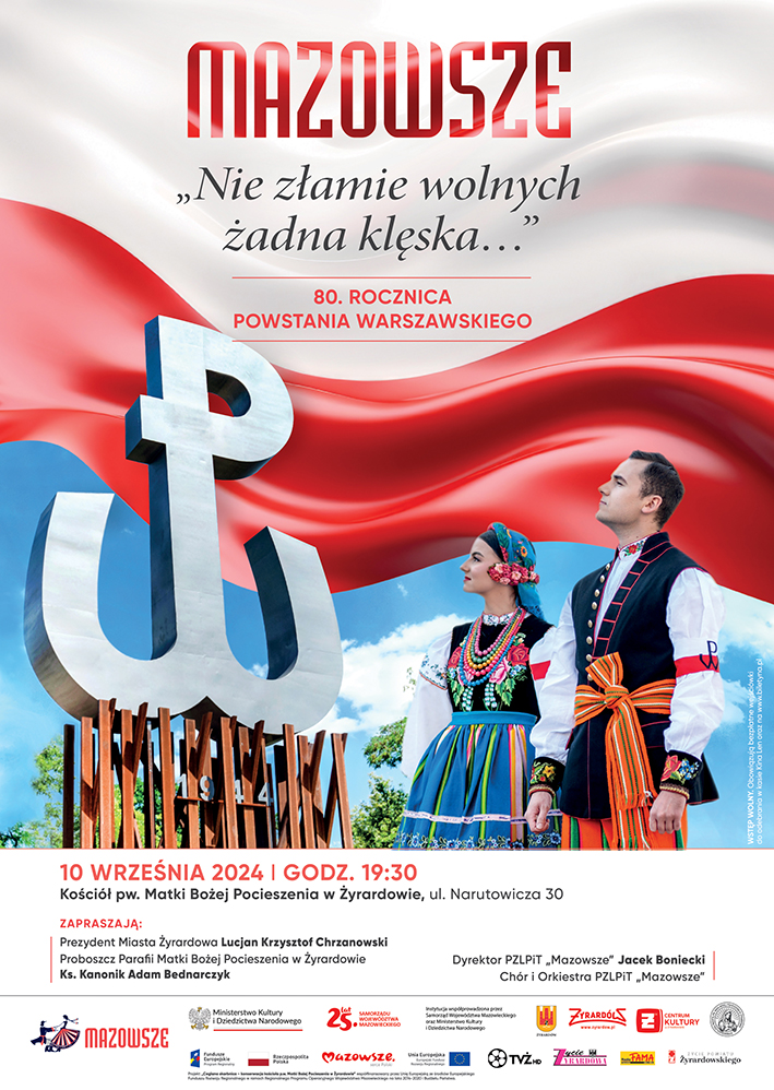 Wyjątkowy koncert z okazji 80. rocznicy Powstania Warszawskiego, który będzie hołdem dla bohaterów tamtych dni, a także okazją do wspólnego celebrowania polskiej kultury i tradycji. Podczas koncertu chór i orkiestra zespołu „Mazowsze” pod dyrekcją maestro Jacka Bonieckiego zaprezentują repertuar pełen wzruszających pieśni patriotycznych oraz utworów związanych z Powstaniem Warszawskim. Występ będzie nie tylko muzycznym przeżyciem, ale również momentem refleksji nad historią i dziedzictwem naszego narodu.