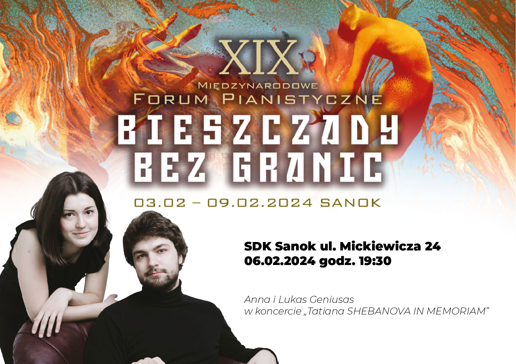 Podkarpacka Fundacja Rozwoju Kultury główny organizator XIX Międzynarodowego Forum Pianistycznego „Bieszczady bez granic” zaprasza na wyjątkowe koncerty wieczorne w dniach 3-9.02.2024 w Sanoku. Na przełomie stycznia i lutego Sanok staje się Zimową Stolicą Pianistyki goszcząc każdorazowo do 300 uczestników z kilkunastu krajów Europy. Forum to bogata oferta kulturalna, którą zrozumie amator odkrywający dopiero muzykę klasyczną oraz z rozkoszą przysłucha się jej wytrawny meloman i muzyk. Zróżnicowanie oferty koncertowej ma na celu poszerzenie oferty kulturalnej o wydarzenia, które zachęcą do aktywności szerszą publiczność.