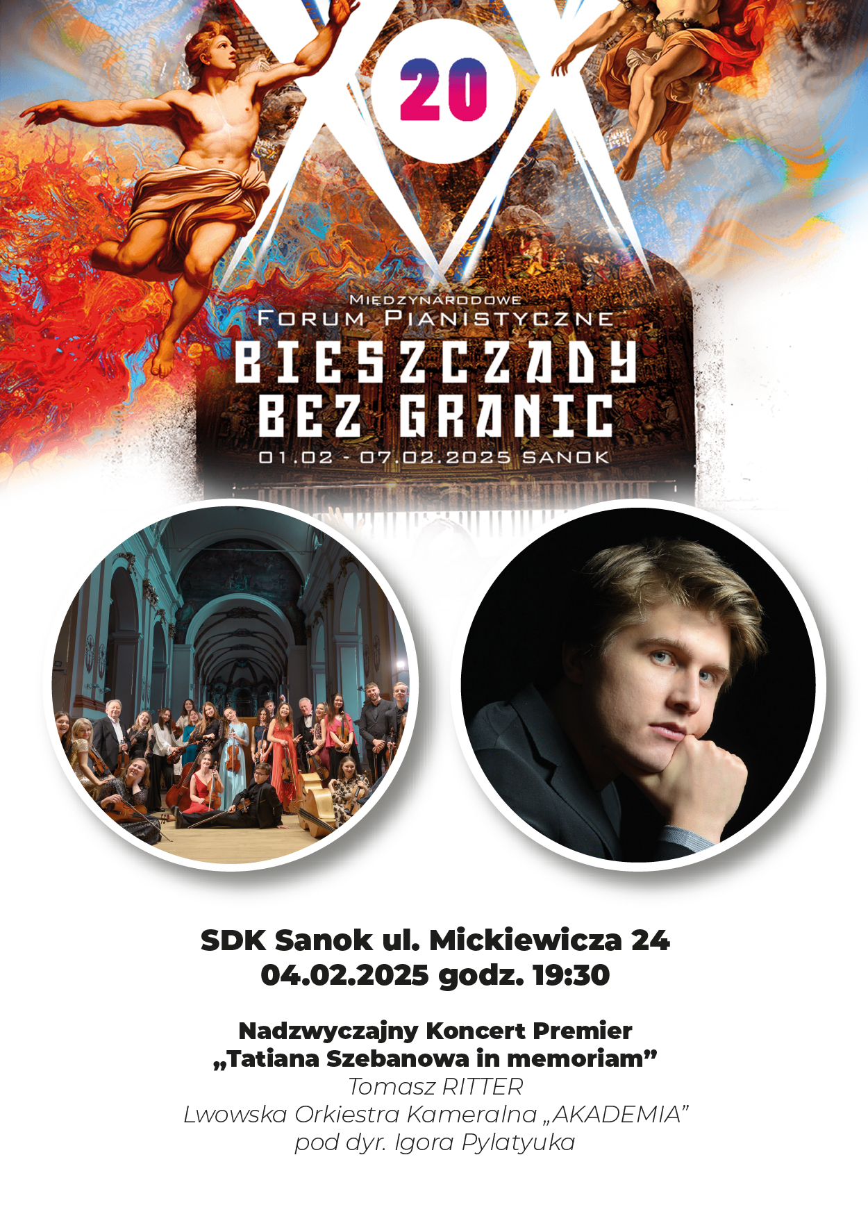 Podkarpacka Fundacja Rozwoju Kultury główny organizator XX Międzynarodowego Forum Pianistycznego „Bieszczady bez granic” zaprasza na wyjątkowe koncerty wieczorne w dniach 1-7.02.2025 w Sanoku. Na przełomie stycznia i lutego Sanok staje się Zimową Stolicą Pianistyki goszcząc każdorazowo do 300 uczestników z kilkunastu krajów Europy. Forum to bogata oferta kulturalna, którą zrozumie amator odkrywający dopiero muzykę klasyczną oraz z rozkoszą przysłucha się jej wytrawny meloman i muzyk. Zróżnicowanie oferty koncertowej ma na celu poszerzenie oferty kulturalnej o wydarzenia, które zachęcą do aktywności szerszą publiczność.