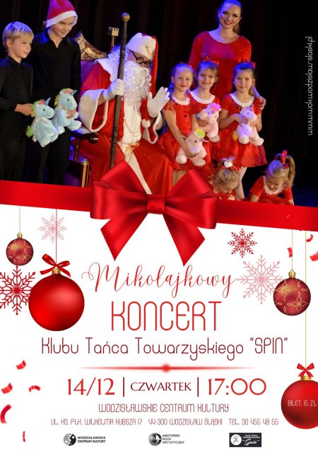 Klub Tańca Towarzyskiego SPIN zaprasza na wyjątkowy, mikołajkowy koncert taneczny do Wodzisławskiego Centrum Kultury 14 grudnia na godz. 17:00 do Wodzisławskiego Centrum Kultury. Prócz pokazów tanecznych na małych widzów czekać będzie św. Mikołaj.