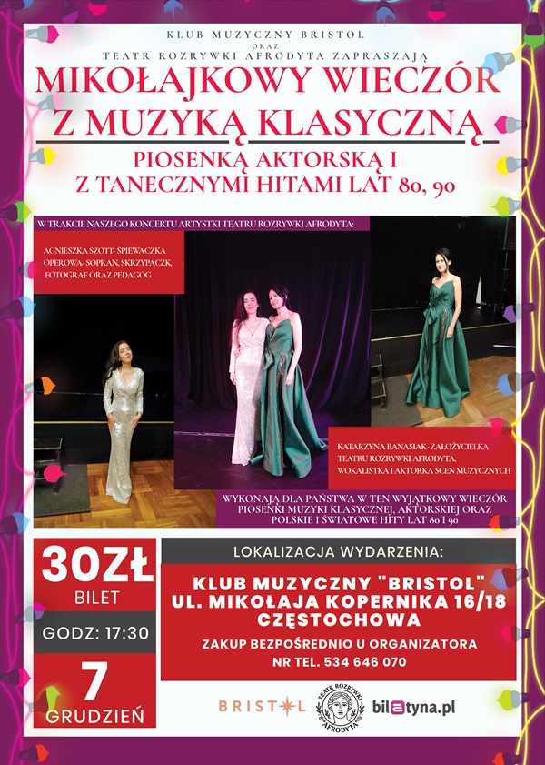 Zapraszam Państwa na wyjątkowy i niezapomniany, pełen emocji koncert pod nazwą "Mikołajkowy wieczór z muzyką klasyczną, piosenką aktorską oraz z polskimi i zagranicznymi hitami lat 80 i 90".