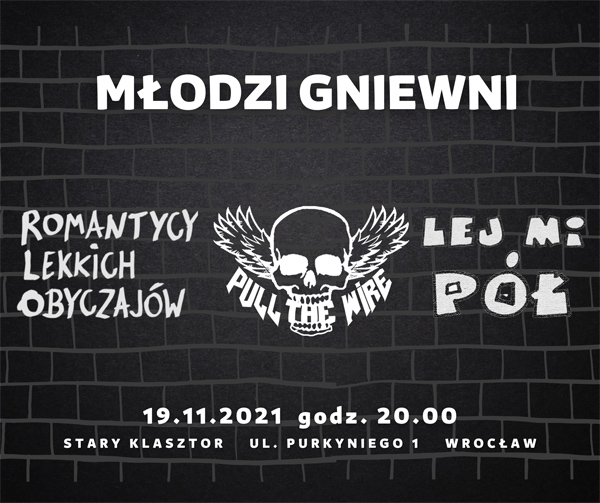 ROMANTYCY LEKKICH OBYCZAJÓW, PULL THE WIRE, LEJ MI PÓŁ, czyli spotkanie nieobliczalną, bezkompromisową muzyką rockową w Starym Klasztorze! To pierwszy wrocławski, klubowy koncert Lej Mi Pół, pierwszy tegoroczny, i pierwszy od 2018 roku wrocławski koncert Romantyków Lekkich Obyczajów. Pierwszy tegoroczny koncert Pull The Wire, dla których to wizyta po 22 miesiącach nieobecności, a dodatkowo z nowym albumem "Życie to Western". "Kapsle", "Lodziarka", "Łabędzie", to tylko niektóre utwory które zabrzmią w Klasztorze. Nie może Ciebie zabraknąć, potrzebni są nam chórzyści!
