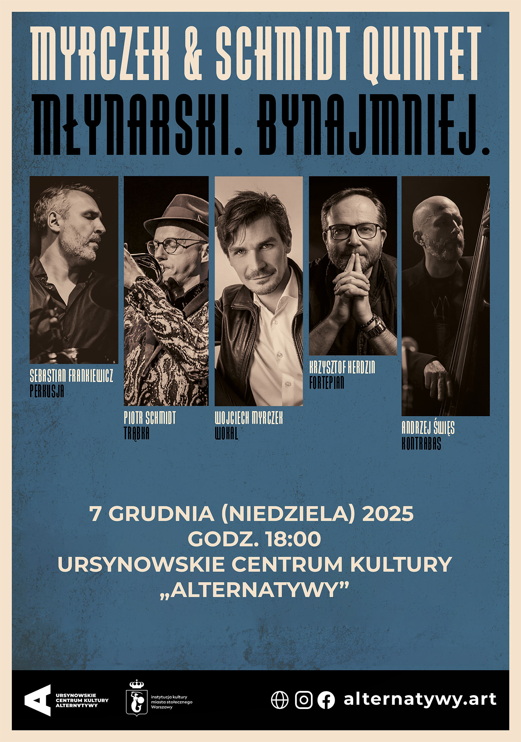 Nowe spojrzenie na teksty Wojciecha Młynarskiego. Świeże aranżacje Krzysztofa Herdzina i Sabiny Meck, niezwykła charyzma wykonawców oraz mistrzowskie budowanie nastroju – to gwarancja niezapomnianych emocji. Koncert przenosi słuchaczy w świat najwyższej klasy jazzu i wciąż aktualnych tekstów Wojciech Młynarskiego. Usłyszymy znane i lubiane utwory, między innymi „Bynajmniej”, „Księżyc nad Kościeliskiem czy „Dziewczyny, bądźcie dla nas dobre na wiosnę”. Na scenie spotykają się artyści, których nie trzeba przedstawiać – Piotr Schmidt, Wojciech Myrczek i Krzysztof Herdzin – uznani muzycy o imponującym dorobku artystycznym, a także wybitni instrumentaliści: Andrzej Święs (kontrabas) i Sebastian Frankiewicz (perkusja). To projekt pełen pasji, elegancji i artystycznej doskonałości. Dzięki gwiazdorskiej obsadzie będzie to niezapomniana muzyczna podróż.