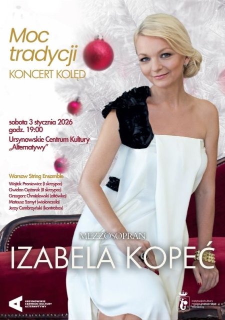Program obejmujący kilkanaście najpiękniejszych tradycyjnych polskich kolęd, zaaranżowanych na mezzosopran i kwintet smyczkowy. Podczas koncertu usłyszymy między innymi „Cichą noc”, „Wśród nocnej ciszy”, „Przybieżeli do Betlejem” czy „Lulajże Jezuniu”. Wydarzenie będzie kontynuacją albumu mezzosopranistki Izabeli Kopeć pod tytułem „Moc tradycji”, prezentującego ponadczasowe piękno polskich kolęd w kameralnej odsłonie. Na scenie obok artystki wystąpią Wojtek Proniewicz (I skrzypce), Gwidon Ciężarek (II skrzypce), Grzegorz Chmielewski (altówka), Mateusz Szmyt (wiolonczela) oraz Jerzy Cembrzyński (kontrabas).