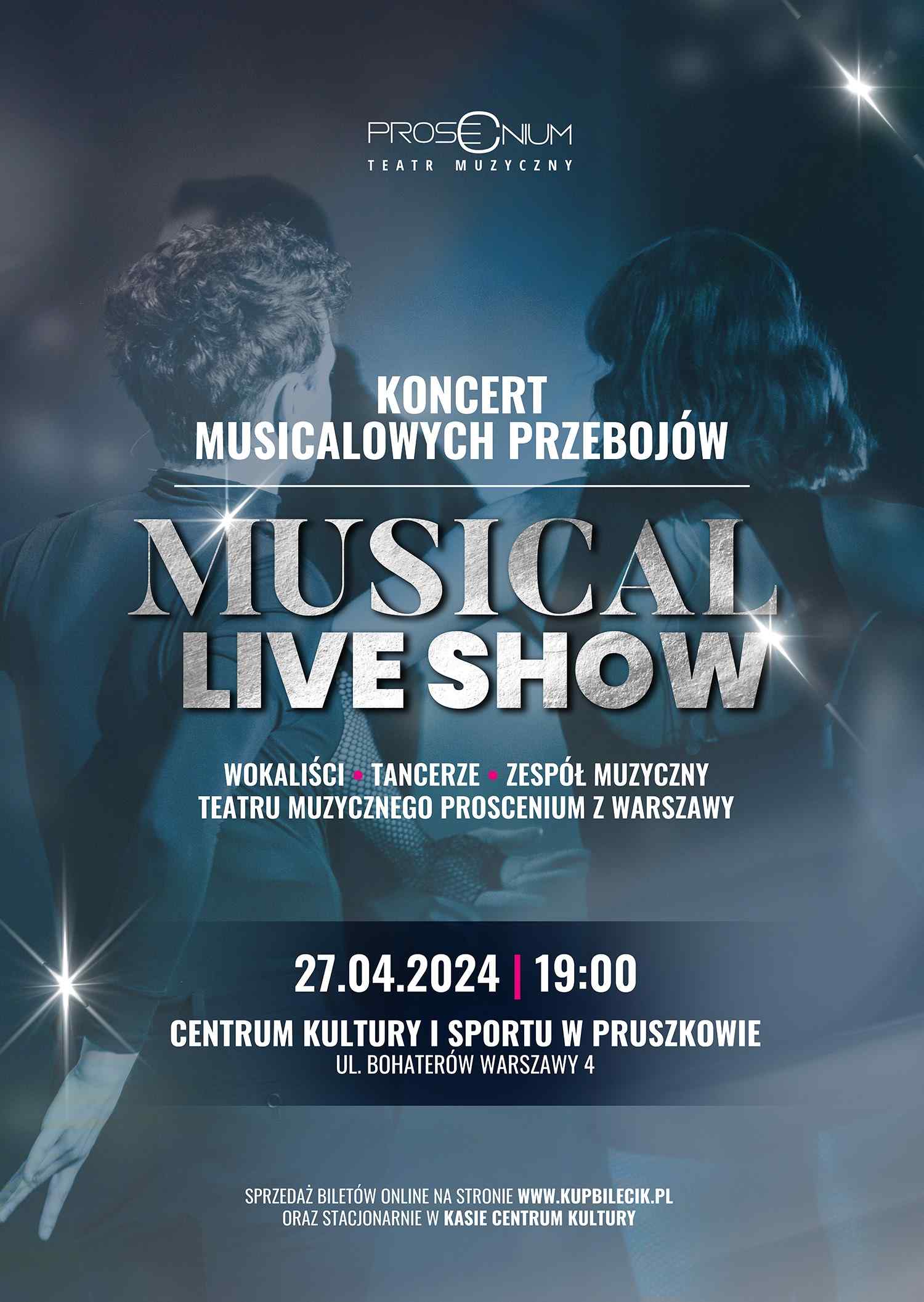 Zapraszamy na koncert musicalowych przebojów! Musical Live Show to dwie godziny muzyki na najwyższym poziomie, w trakcie których widzowie usłyszą największe musicalowe hity w wykonaniu artystów Teatru Muzycznego Proscenium z Warszawy. W repertuarze utwory z takich musicali jak "Les Miserables", "Koty", "Mamma Mia", "Grease", "Skrzypek na dachu" czy "Cabaret". Koncert prowadzony jest przez kierownika artystycznego zespołu - Antoniusza Dietziusa. Widzowie usłyszą wiele ciekawostek oraz informacji o światowych musicalach. Talent, pasja i muzyka na żywo gwarancjami udanego wieczoru! Reżyseria i prowadzenie: Antoniusz Dietzius Kierownictwo muzyczne: Jarosław Praszczałek Reżyseria dźwięku: Patryk Kuryło Plakat i oprawa graficzna: Szymon Ludwiczak Kierownictwo produkcji: Michał Olechniewicz Produkcja: Fundacja Artystyczna Proscenium Wystąpią aktorzy, wokaliści i tancerze Teatru Muzycznego Proscenium: Aleksandra Lewicka Julia Bielińska Angelika Kurowska Weronika Jeleśniański Małgorzata Miklaszewska Natalia Podsiadła Mateusz Tomaszewski Wojciech Bochra Mikołaj Kisiel Łukasz Obłąk Sergiusz Królak Mateusz Otłowski oraz zespół muzyczny w składzie: Jarosław Praszczałek / fortepian Jakub Bruszewski / gitara basowa Wiktor Wysocki / instrumenty dęte Piotr Goździkowski / perkusja