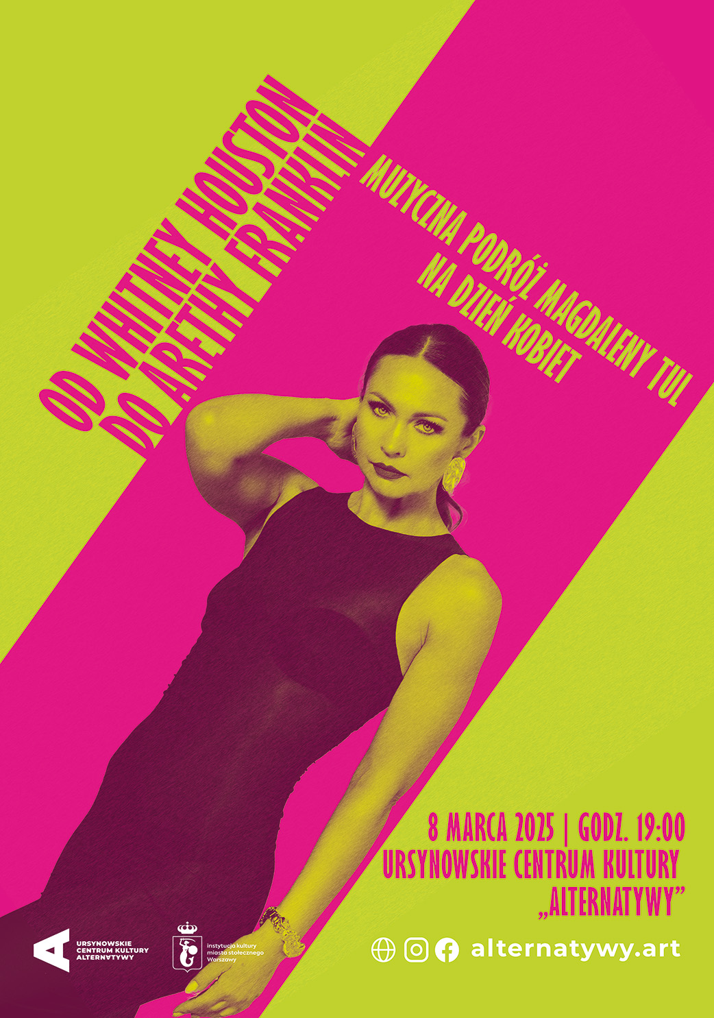 Zapraszamy na wyjątkowy koncert „Od Whitney Houston do Arethy Franklin" – bo każda nuta ma w sobie odrobinę kobiecej duszy. To będzie wieczór pełen energii, emocji i kobiecej siły! Podczas tego niezwykłego wydarzenia Magdalena Tul wystąpi z zespołem, prezentując zarówno swoje autorskie utwory, jak i ponadczasowe hity poświęcone kobietom. W programie usłyszymy m.in. takie przeboje jak: „I’m Every Woman”, „Jestem kobietą”, „Superwoman”, „Single Ladies” oraz wiele innych piosenek, które na stałe zapisały się w historii muzyki, jako celebrujące kobiecą moc, niezależność i piękno. Artystka znana ze swojej charyzmy, mocnego głosu i wyjątkowej scenicznej energii zabierze publiczność w muzyczną podróż, która poruszy serca i dostarczy niezapomnianych wrażeń. To koncert dla wszystkich – kobiet i mężczyzn – którzy pragną spędzić ten dzień w atmosferze radości, inspiracji i wspólnego świętowania. Magdalena Tul to artystka o niezwykłej wrażliwości i scenicznym doświadczeniu, która od lat zachwyca publiczność swoimi kompozycjami, m.in. jako reprezentantka Polski w konkursie Eurowizji, czy interpretacjami znanych utworów jako wokalistka w popularnym programie TV „Jaka to melodia”. Jej koncerty to gwarancja autentycznych emocji i muzycznej uczty na najwyższym poziomie.