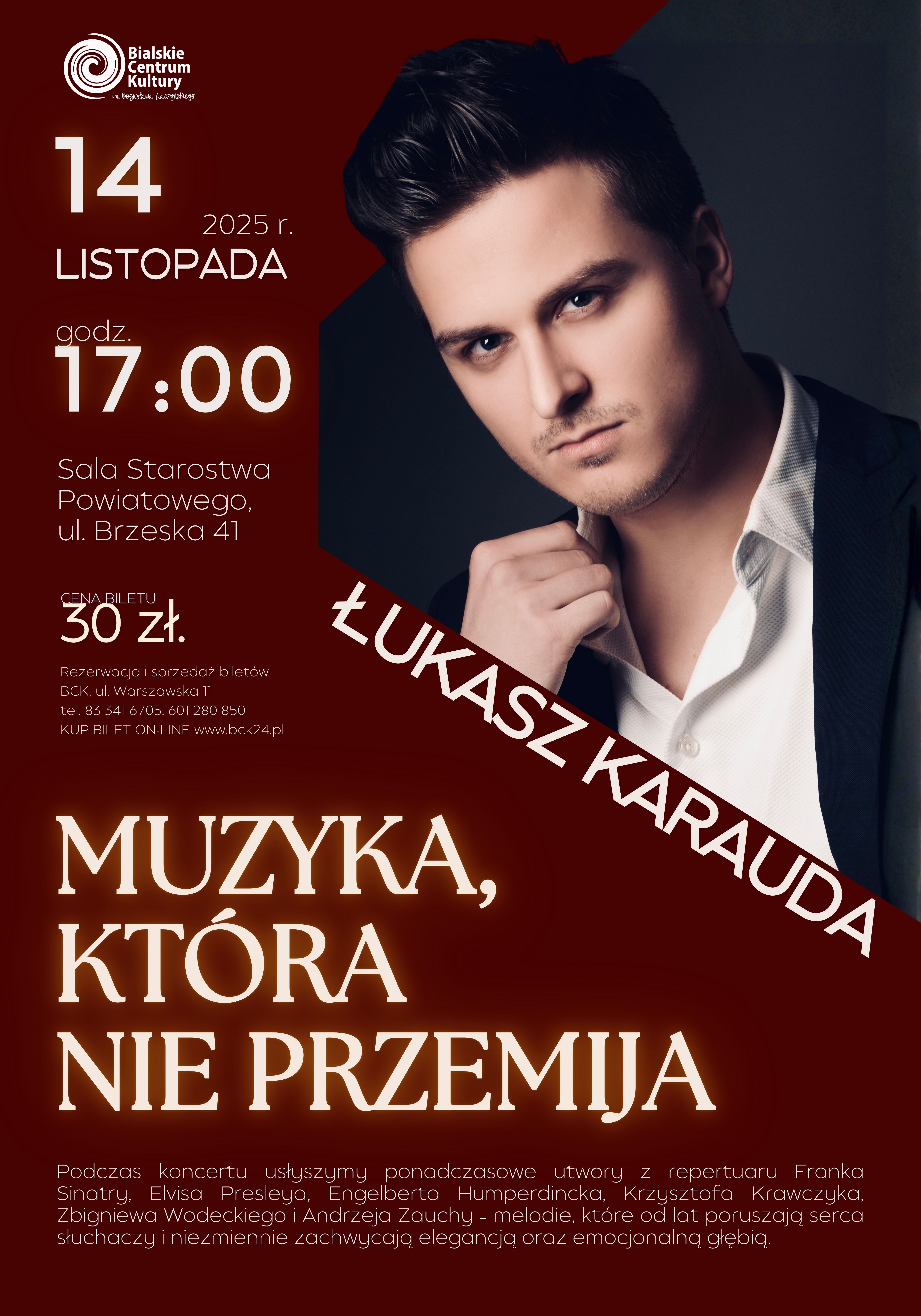 Podczas koncertu usłyszymy ponadczasowe utwory z repertuaru Franka Sinatry, Elvisa Presleya, Engelberta Humperdincka, Krzysztofa Krawczyka, Zbigniewa Wodeckiego i Andrzeja Zauchy- melodie, które od lat poruszają serca słuchaczy i niezmiennie zachwycają elegancją i emocjonalną głębią. Wykona je Łukasz Karauda. Wybitny młody śpiewak operowy, absolwent prestiżowej uczelni Royal Welsh College of Music and Drama w Wielkiej Brytanii, którą ukończył z wyróżnieniem