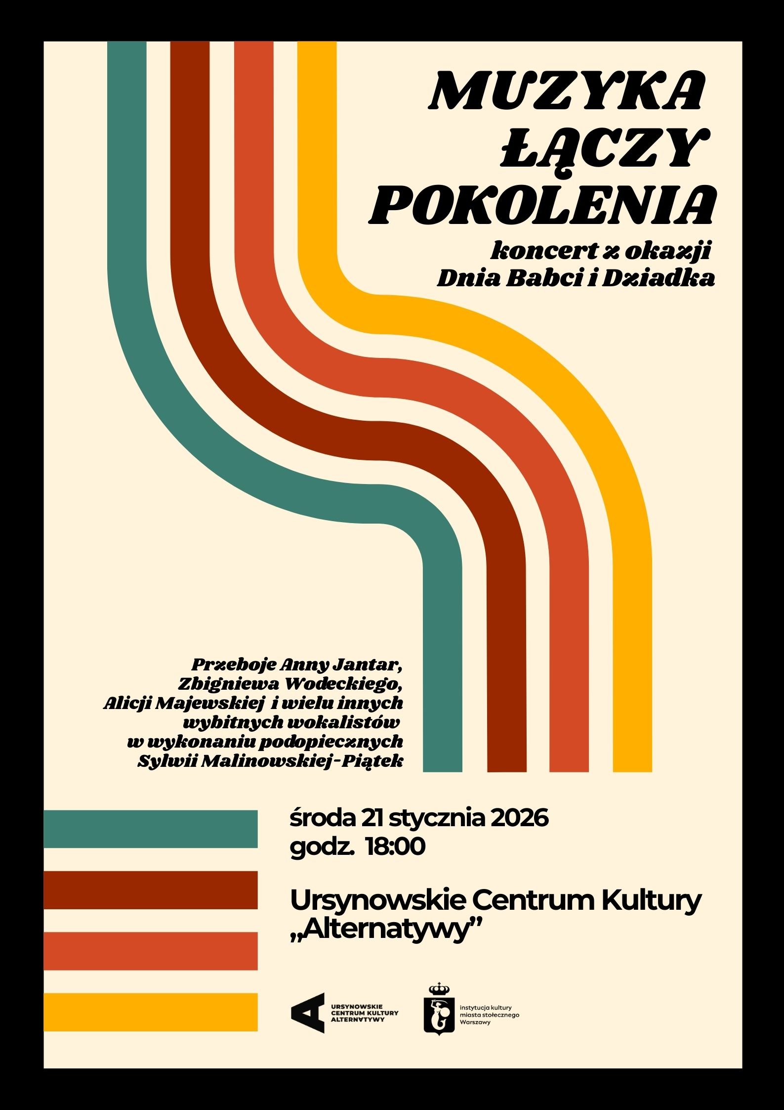 Podopieczni Sylwii Malinowskiej-Piątek zapraszają na wyjątkowy koncert, w którym młode pokolenie zaśpiewa dla starszego utwory ważne, piękne i pełne wspomnień. W programie znajdą się przeboje z repertuaru między innymi Anny Jantar, Zbigniewa Wodeckiego, Alicji Majewskiej i innych artystów, którzy towarzyszyli słuchaczom w ich młodszych latach i na trwałe zapisali się w historii polskiej muzyki. To będzie spotkanie różnych generacji, które pokazuje, że dobre piosenki nie starzeją się nigdy, a emocje zaklęte w muzyce potrafią budować mosty między ludźmi. Na scenie wystąpią młodzi wokaliści oraz ich nauczycielka – Sylwia Malinowska-Piątek, dodając koncertowi wyjątkowego, osobistego charakteru. To będzie wieczór pełen wzruszeń, wspomnień i wspólnego muzykowania.