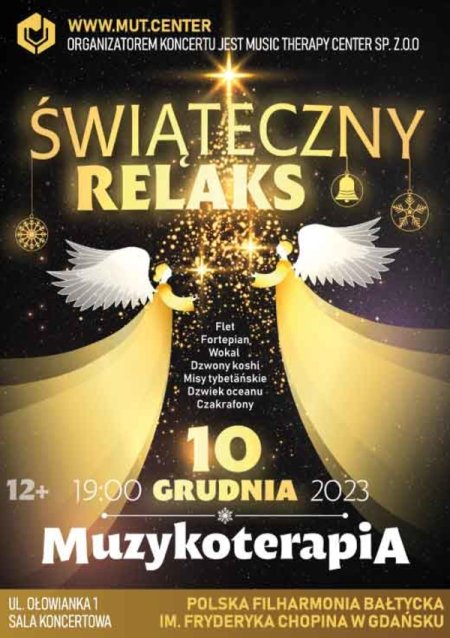 Zapraszamy na magiczny, niezwykły i ciepły wieczór „Muzykoterapia. Świąteczny relaks” – wyjątkowe autorskie opracowanie Międzynarodowego Centrum Muzykoterapii! W przytulnej atmosferze przygaszonego światła i świec można się zrelaksować przy wspaniałej muzyce z urzekającym wideo na wielkim ekranie projekcyjnym i efektem rozgwieżdżonego nieba w Sali Koncertowej Filharmonii Bałtyckiej! Tego wieczoru będziecie mogli naprawdę poczuć wdzięczność, radość i magię oraz cieszyć się nagromadzoną, cudowną „brzmiącą ciszą”, pod koniec wieczoru nawet powietrze będzie rozbrzmiewało pięknem! „Muzykoterapia” to specjalna, relaksacyjna forma koncertów, podczas których muzyka rozbrzmiewa nieprzerwanie, wprowadzając w stan głębokiego relaksu, zanurzenia w sobie i swoich myślach, emocjach, uczuciach. Stres zostaje złagodzony, ciało skutecznie zrelaksowane i zregenerowane. W programie ponadczasowe klasyki: kolęda „Cicha noc”, nastrojowa „Zima” Vivaldiego, kojąca „Kołysanka” Brahmsa, uroczysty „Chorał” Bacha i inne znane na całym świecie melodie. Niepowtarzalne połączenie brzmienia fortepianu, fletu, skrzypiec i wokalu z niezwykłymi instrumentami do terapii dźwiękiem – delikatnymi i miękkimi misami tybetańskimi, dźwięcznymi czakrafonami, lekkimi dzwoneczkami Koshi, mistycznym glukofonem, kartalami, szumem strumienia, deszczem, oceanem i innymi odgłosami natury… Dziękujmy za Wasze ciepłe przyjęcie i entuzjastyczne opinie! "Poprostu wspaniale! Niezapomniane doznania, jak gdyby zanurzyć się w świat pełen miłości, ciepła i dobrego samopoczucia!” „Muzyka sprawiała, że zatapiałem się w myślach, myślałem o przyszłości i teraźniejszości. Zatrzymaj się na chwilę w czasie.” „Wspomnienia z dzieciństwa. Radość i beztroski stan…”