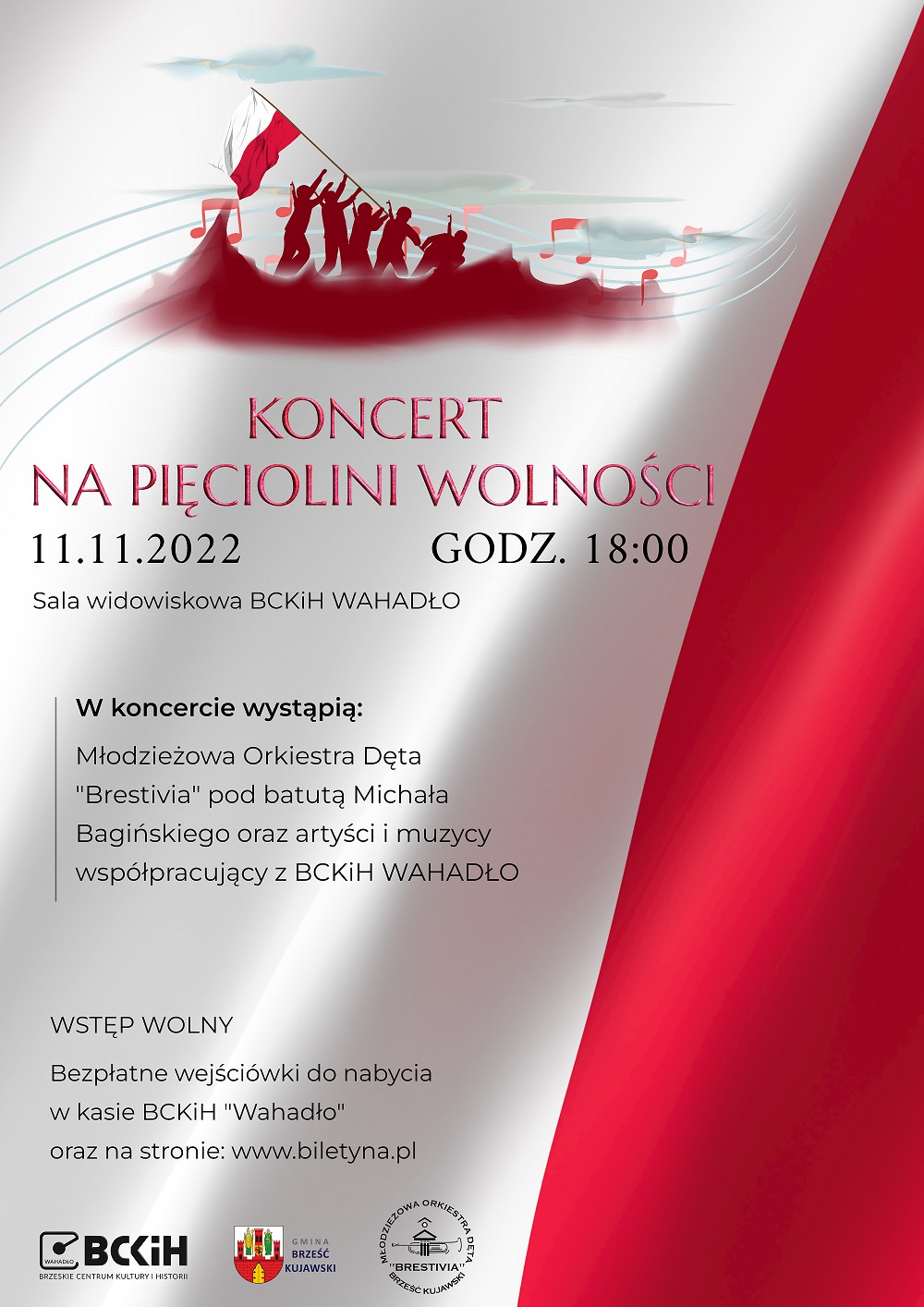 Tradycyjnie 11 listopada w Narodowe Święto Niepodległości zapraszamy na koncert pieśni patriotycznych do Brzeskiego Centrum Kultury i Historii "WAHADŁO" w Brześciu Kujawskim. Tym razem koncert pt. "Na pięciolini Wolności". Pieśni, które towarzyszyły nam w różnych okresach naszej historii w wyjątkowych aranżacjach zagra Młodzieżowa Orkiestra Dęta "Brestivia" pod batutą Michała Bagińskiego, działająca przy BCKiH "WAHADŁO" oraz zaproszeni wokaliści.