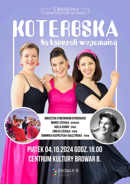 Maria Koterbska była jedną z największych gwiazd swojego pokolenia – zachwycała nie tylko głosem, ale i poczuciem humoru, klasą, wdziękiem i niesamowitą energią! W 2024 roku mija 100 lat od urodzin tej niezwykłej artystki –chcemy to uczcić przypominając jej największe przeboje! W programie znajdą się takie kompozycje jak "Do grającej szafy grosik wrzuć", "Karuzela", "Augustowskie Noce", "Brzydula i rudzielec", czy oczywiście "Serduszko puka w rytmie cza-cza", a wykonają je trzy utalentowane absolwentki kierunku Wokalistyka Jazzowa Akademii Muzycznej w Bydgoszczy: Emilia Czekała–wokalistka, konferansjerka, dyrektorka Orkiestry Symfoników Bydgoskich, Dominika Kasprzycka-Gałczyńska, wokalistka w zespole Singin’Birds, zwyciężczyni m. in. w konkursie Pamięci Andrzeja Zauchy “Serca bicie” oraz Adela Konop, zdobywczyni m. in. Grand Prix na prestiżowym festiwalu Ladies Jazz w Gdyni.