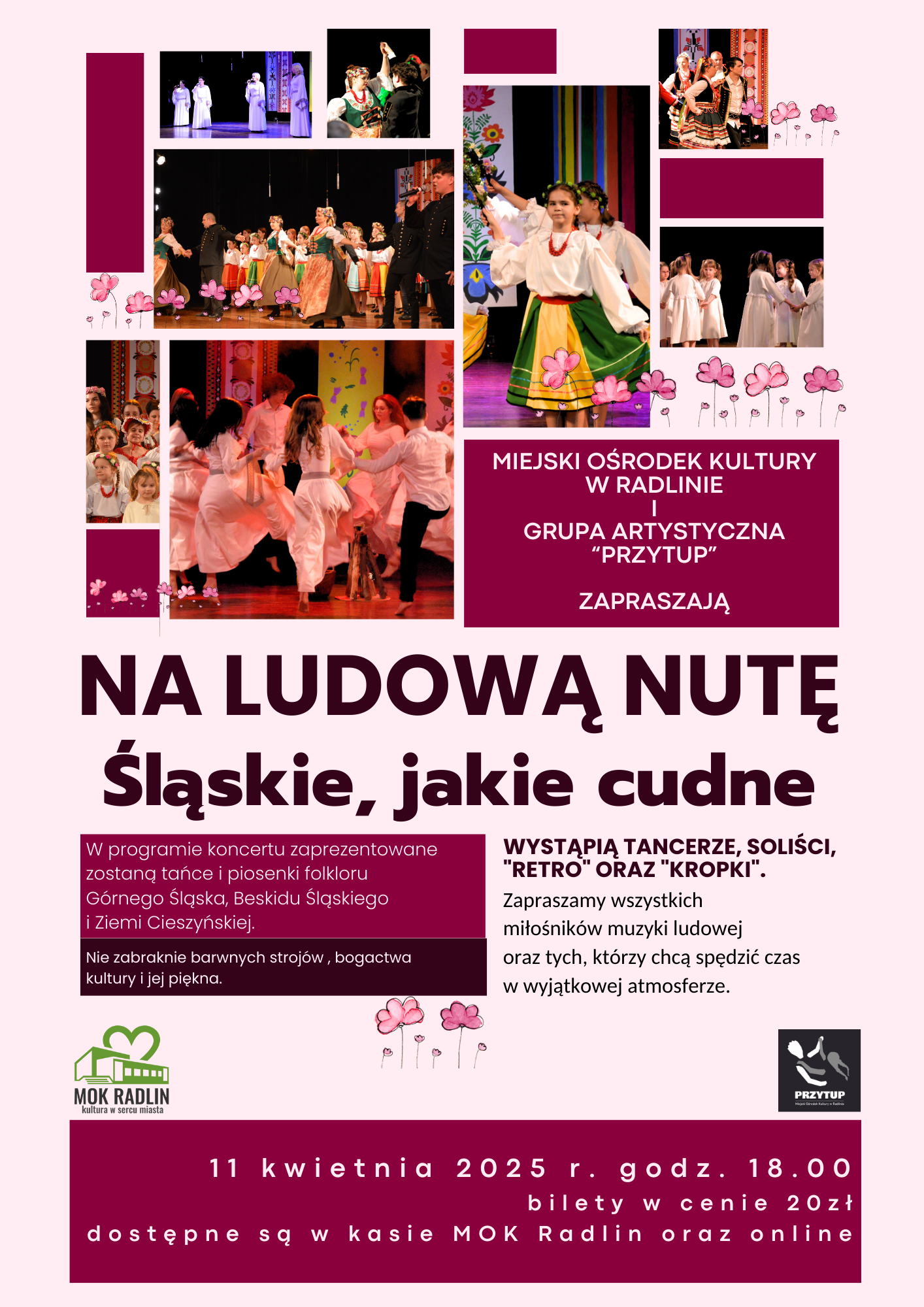 W programie koncertu zaprezentowane zostaną tańce i piosenki folkloru Górnego Śląska, Beskidu Śląskiego i Ziemi Cieszyńskiej. Wystąpią : Grupa Artystyczna "Przytup"- soliści, "Retro" oraz "Kropki".