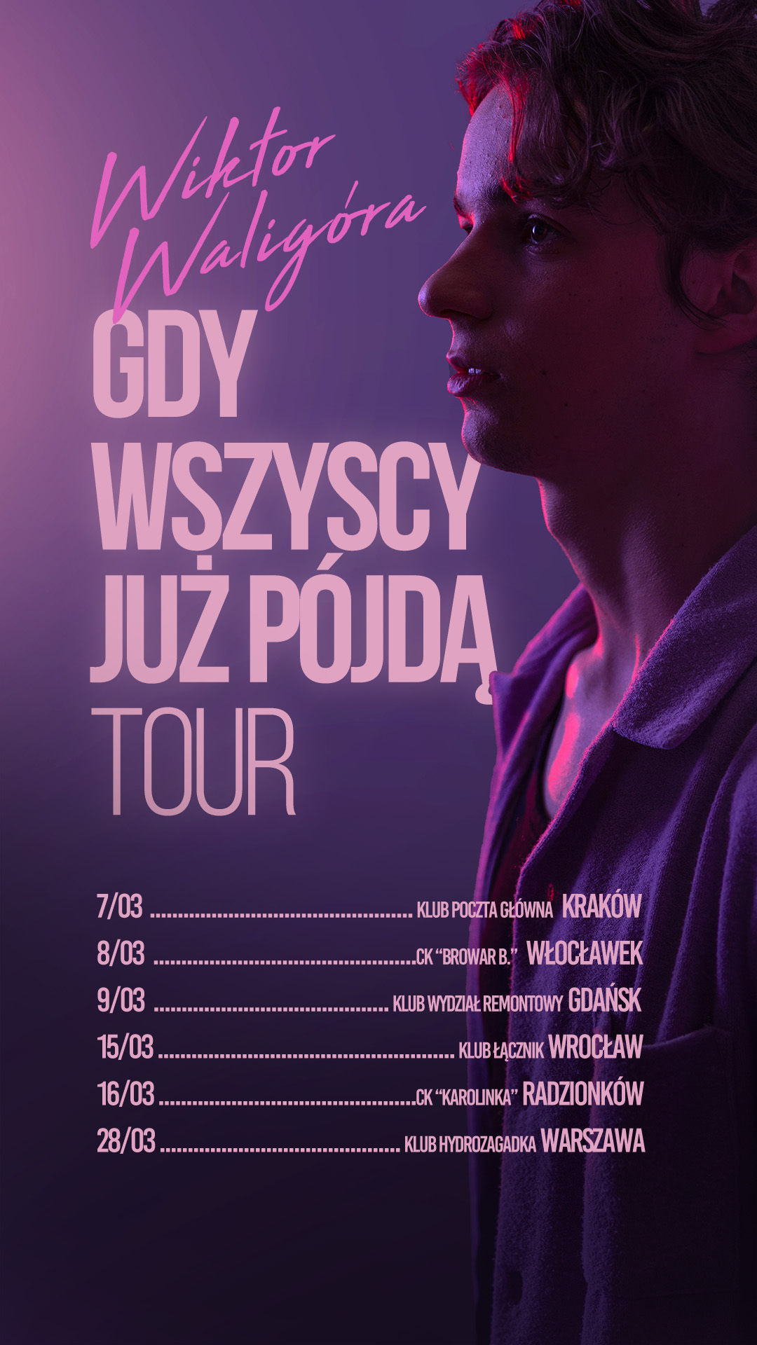 Wiktora Waligóry – „Czekam na świt”. Dzień po premierze krążka numery z płyty wybrzmiały na żywo na warszawskiej męskograniowej scenie. Teraz artysta ogłasza swoją pierwszą solową trasę koncertową „WIKTOR WALIGÓRA | GDY WSZYSCY JUŻ PÓJDĄ TOUR”. Młody debiutant planuje odwiedzić polskie miasta, prezentując swoje największe hity, a także emocjonalne ballady i porywające gitarowe numery. Koncerty będą okazją do spotkania oraz doświadczenia wyjątkowej energii, którą Wiktor wnosi na scenę.