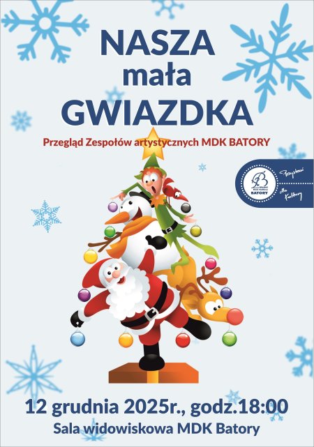 W zimowy, grudniowy wieczór odbędzie się koncert, podsumowujący działalność grup artystycznych Miejskiego Domu Kultury Batory pn. „Nasza mała gwiazdka”. Uczestnicy koncertu, specjalnie na tę okazję przygotowują program artystyczny. Wystąpią grupy taneczne: Crazy Monkeys Mini, Crazy Monkeys oraz Crazy Monkeys New, Biliv it, Why Not, Balet- grupa starsza i młodsza, Na Chillku, Hip Hop 30+ Voltaren Emul Dance, Bez Pośpiechu, Why Not, Wiercipiętki, A.C.O. Crew, Taniec Współczesny Flow Moment, Latino Solo, a także uczestnicy zajęć Zumby. Ponadto zaprezentują się uczestnicy warsztatów gitarowych i zespoły: Na szlaku oraz Zespół Pieśni i Tańca Chorzów i Młodzieżowa kapela Ludowa.