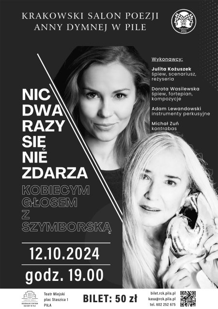 W świat utworów Wisławy Szymborskiej wprowadzą nas wspaniali artyści: Julita Kożuszek (śpiew), Dorota Wasilewska (fortepian, śpiew), Michał Zuń (kontrabas) oraz Adam Lewandowski (instrumenty perkusyjne).