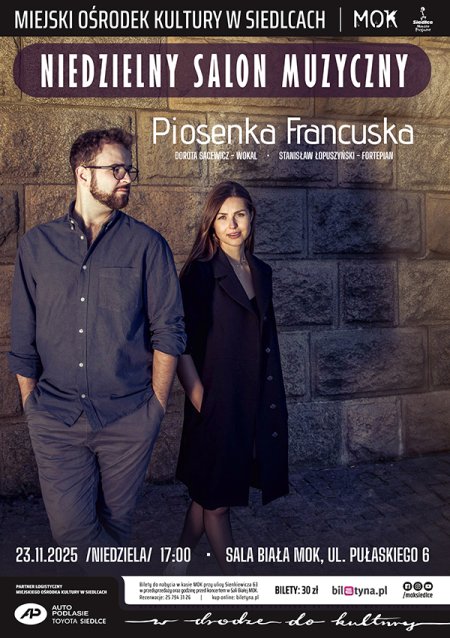W ramach cyklu Niedzielny Salon Muzyczny zapraszamy na wyjątkowy recital piosenki francuskiej. Podczas koncertu publiczność przeniesie się pod rozgwieżdżone niebo Paryża, by posłuchać utworów inspirowanych twórczością takich artystów jak Jacques Brel, Édith Piaf czy Arthur Rimbaud. Artyści związani z Francją - Dorota Sacewicz i Stanisław Łopuszyński - przygotowali program, który łączy klasykę francuskiej piosenki z autorskimi kompozycjami.
