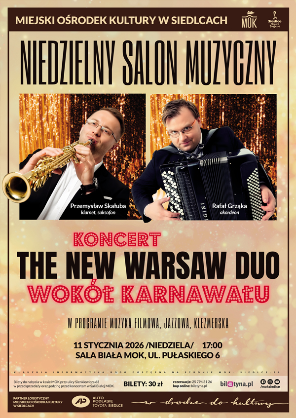 Zapraszamy na pierwsze w nowym roku spotkanie z cyklu Niedzielny Salon Muzyczny. Już 11 stycznia w Sali Białej MOK odbędzie się koncert The New Warsaw Duo pt. „Wokół karnawału”.