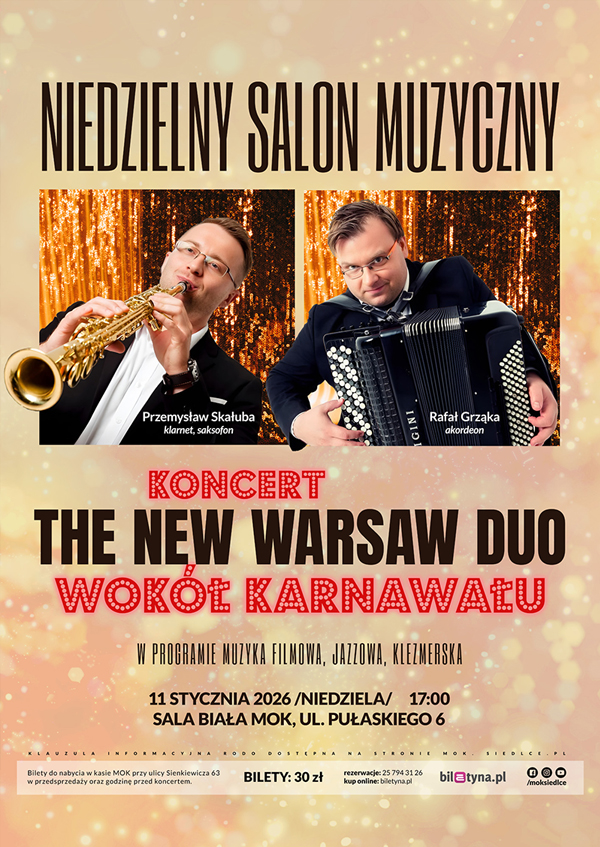 Zapraszamy na pierwsze w nowym roku spotkanie z cyklu Niedzielny Salon Muzyczny. Już 11 stycznia w Sali Białej MOK odbędzie się koncert The New Warsaw Duo pt. „Wokół karnawału”.