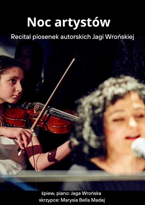 Recital piosenek autorskich Jagi Wrońskiej. Po raz pierwszy w Krakowie usłyszymy piosenki napisane przez artystkę, zebrane w formie recitalu. Autorskie teksty i muzyka będą większością, ale usłyszymy także kilka melodii napisanych do tekstów innych krakowskich poetów. To wieczór pełen ciepła, wzruszeń, romantyzmu, refleksji i pozytywnej energii.Jaga Wrońska, znana ze swego rozległego i monumentalnego repertuaru, tym razem bardziej kameralnie i lirycznie wyśpiewa swoje teksty. Nie zabraknie też motywów związanych z Krakowem, wszak to prawdziwe miasto artystów. Dziś krakowska bohema to już zjawisko unikatowe, gdzie ,,…odmiennym jakby rytmem u nas ludziom bije serce …”- jak śpiewają Grzegorz T. i Andrzej S. Jadze Wrońskiej towarzyszyć będzie niezwykła młoda skrzypaczka Marysia Bella Madej – prywatnie córka artystki, wielokrotna laureatka Międzynarodowych i Ogólnopolskich konkursów skrzypcowych oraz wspaniała interpretatorka piosenki artystycznej. Każde spotkanie sceniczne z Jagą Wrońską to wyjątkowy, niezapomniany czas. Tym razem też tak będzie. Jaga Wrońska kocha swoją publiczność i jest to miłość odwzajemniona!
