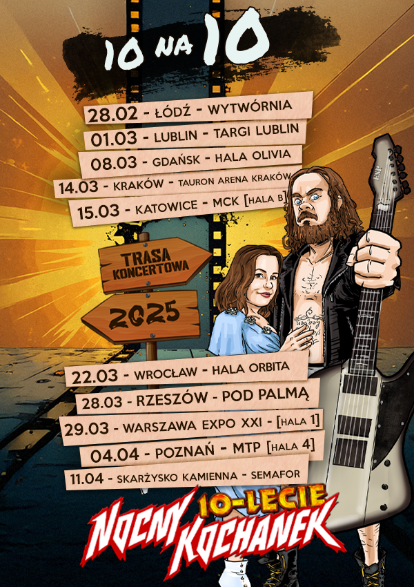 🎸 Jubileuszowa trasa "10 NA 10" – Nocny Kochanek świętuje 10-lecie i premierę albumu "Urwany Film"! Największe hity dekady + nowy krążek zagrany w całości. Hewimetalowe riffy, humor i metalowa energia w wyjątkowym widowisku! 🎟️ Zarezerwuj bilet i dołącz do świętowania!