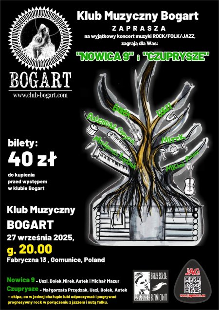 Nowica 9 i Czuprysze — ekipa, co w jednej chałupie lubi odpoczywać i pogrywać progresywny rock w połączeniu z jazzem i nutą folku. Na basie wszystko napędzi z siłą szybu górniczego Bolek — nieprzejednany twórca i budowniczy rzek, który trzyma groove jak mało kto. Perkusyjny fundament położą kolejno Astek Cuprjak i Mirek Ładoś — chłopcy, co grają taką bazę, że niejeden by chciał, a mało kto potrafi. Astek dodatkowo dorzuci brzmienie organów, kiedy będzie trzeba. Z pięknych ogrodów kwiatowych i warzywnych wyjdzie z saksofonem Uszi Will — zadmie tak, że włosy staną dęba z wielu powodów, nie tylko od dźwięku.