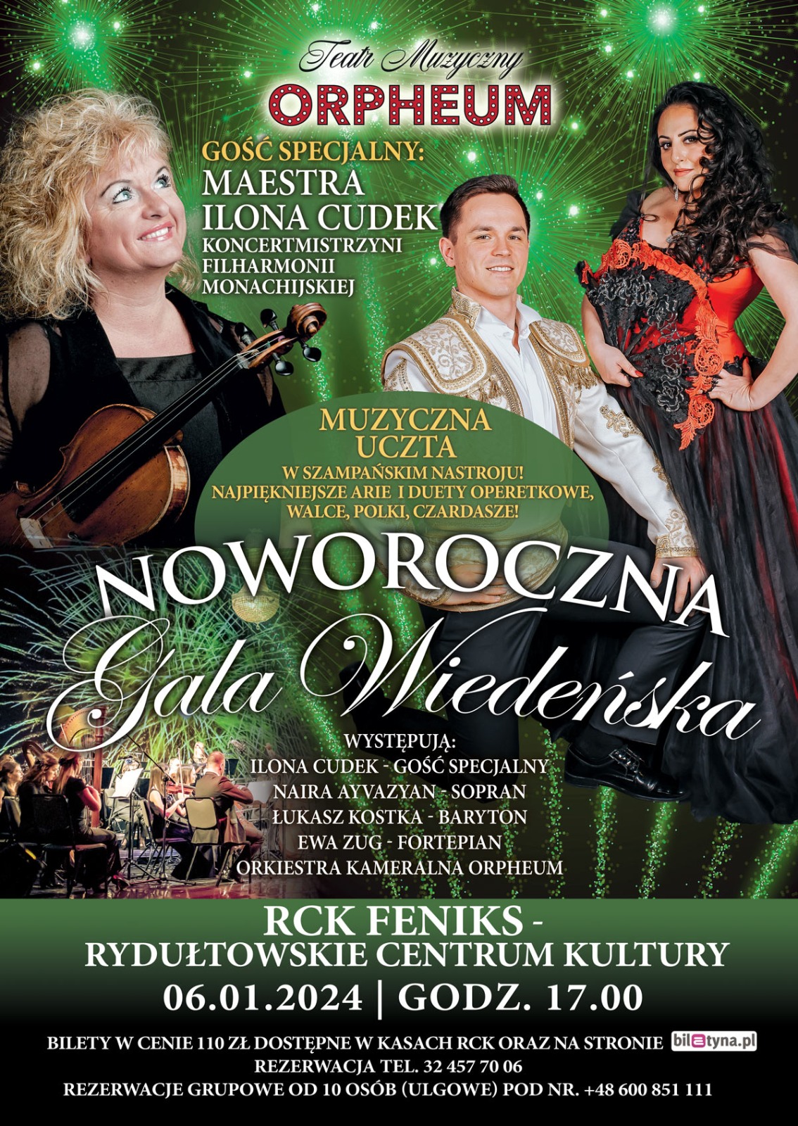 Jedyna w swoim rodzaju propozycja Teatru Muzycznego Orpheum. Noworoczna Gala Wiedeńska w szampańskim nastroju z udziałem znakomitych solistów i orkiestry kameralnej ''Orpheum'' Program koncertu obfitować będzie w najpiękniejsze walce, czardasze, polki oraz arie i duety austro - węgierskich królów operetki jak E. Kalman, Fr. Lehar czy legendarne pokolenia Straussów. Koncert zakończymy zgodnie z tradycją noworoczną przy dźwiękach Marsza Radetzkyego!