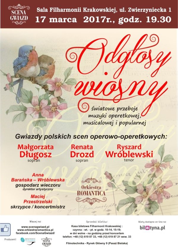 "Odgłosy wiosny" - to radosna propozycja koncertowa skierowana dla tych z Państwa, którzy nie mogą doczekać się wiosny w jej pełnym rozkwicie.